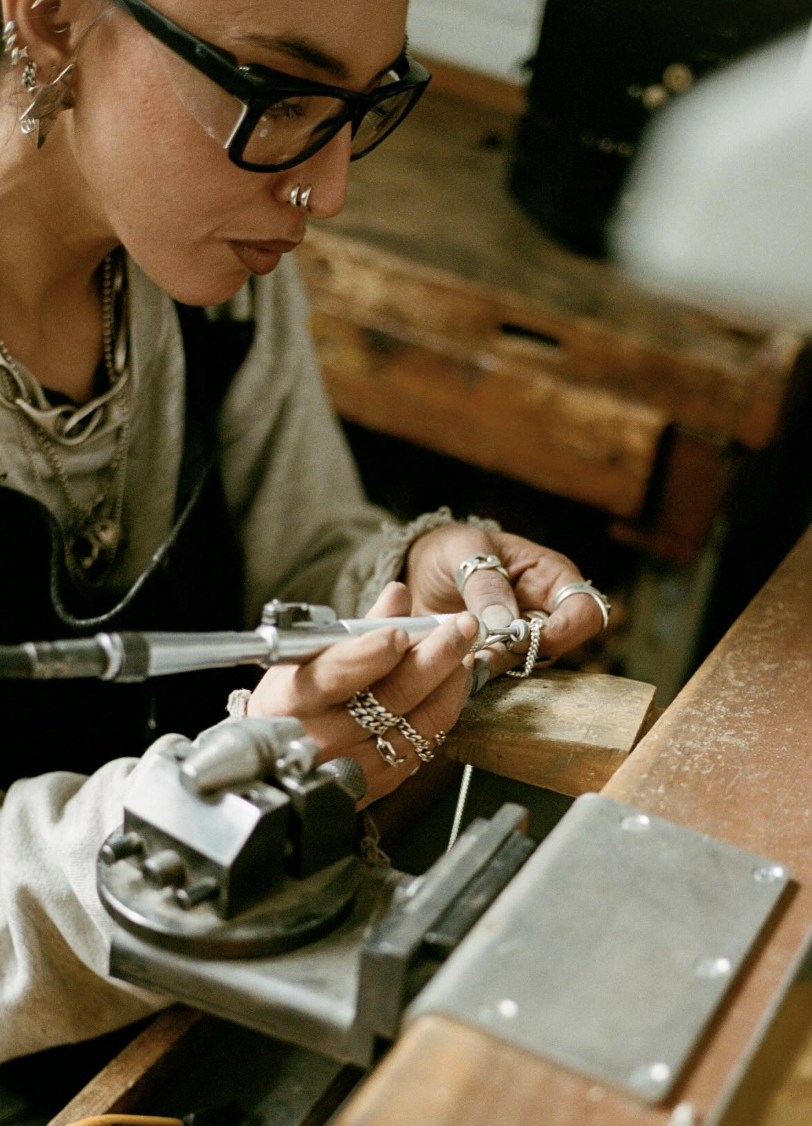 The designer and founder of L.JARDIM, a Brooklyn-based studio established in 2014 and known for industrial, sculptural pieces that blur the line between jewelry and wearable art. Today, her work spans chains, harnesses, face and body jewelry, and custom commissions—each rooted in meticulous craftsmanship and a deeply personal relationship between object and wearer.