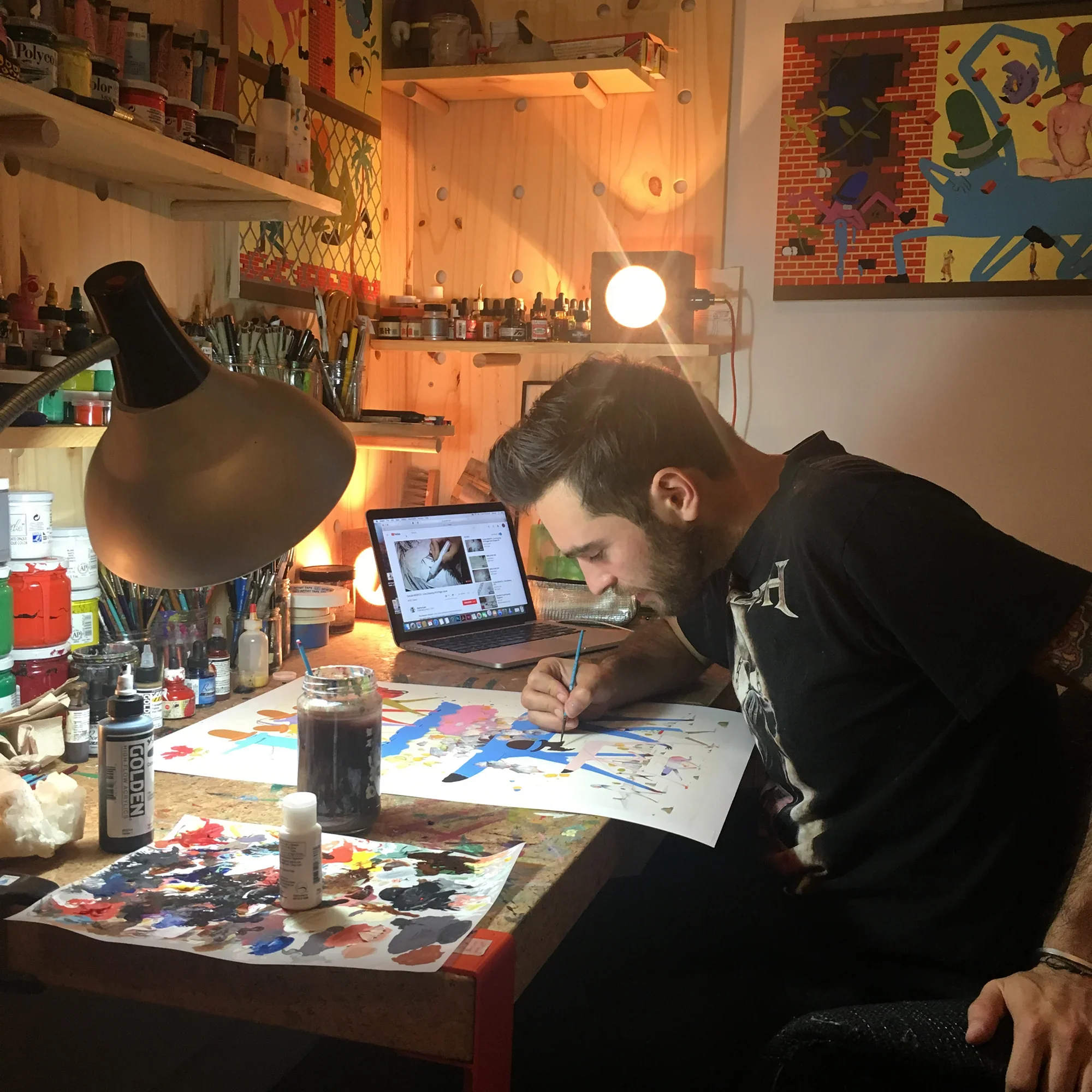 Gosha is a Russian American painter known for bold acrylics, a clear-line style, and a deep command of watercolor. His interest in adaptation stems from moving from Moscow to Hollywood after the collapse of the Soviet Union, where he learned art hands-on while working at a Los Angeles art supply store. He runs Dirty Hands Workshop on the Lower East Side, teaching a technique-forward, accessible approach to painting rooted in connection, change, and creative resilience.